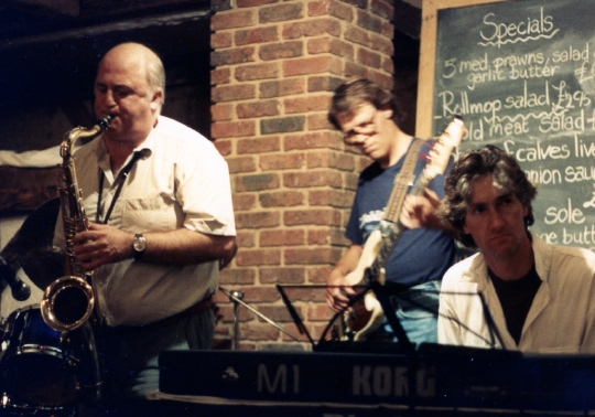 Bob Bernard saxophone, Phil playing his 1966 Fender Jazz Bass and Iain Rae on Korg piano playing at the High Rocks, Tunbridge Wells, Kent in 1990 (ish).